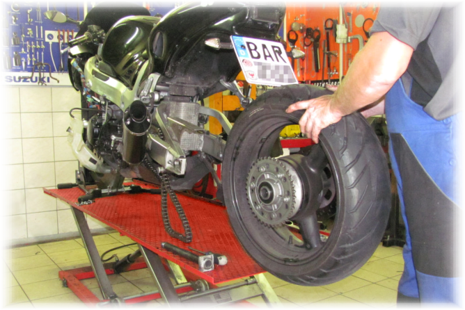 Schmierseife, Talkum und Fingerspitzengefühl braucht man zur Reifenmontage damit weder Reifen noch Felge beschädigt werden. Felgen und Reifen weisen Ungenauigkeiten in der Masseverteilung auf. Das Anbringen von Ausgleichgewichten neutralisiert diese Fertigungsfehler. Die Ausgleichsmasse ermittelt man in der Regel mit der elektronisch messenden Wuchtmaschine. Beim Ausbau des Hinterrades prüfen wir routinemässig  den Zustand der Bremsen und der Endantriebskomponenten. Bleigewichte sind am Motorrad zulässig. Sind sie mit Lack versiegelt ist das auch unbedenklich. Wegen dem hohen spezifischen Gewicht sind sie kompakter. Wuchtgewichte sind nicht schön, stellt jeder fest wenn er seine Felge putzt. Wir plazieren sie deshalb möglichst unauffällig in der Felgenmitte. Gewölbte Gewichte kleben auch auf Rundungen. Selbst bei den meisten Neufahrzeugen fliegen die Originalgewichte vor dem Verkauf in den Schrott. Soetwas würden wir Dir nicht anbieten. Alte Kleberreste gehören entfernt, auch wenn es mühsam ist. Schließlich heißt es ReifenSERVICE. Sag uns welches Ventil Du gern an Deinem Rad verbaut haben möchtest. Die Reparatur von Motorradreifen ist unter bestimmten Umständen zulässig, meist aber eine heikle Angelegenheit. Bei schlauchlosen Reifen an größeren Motorrädern mach wir das nicht. Kann ins Auge gehen. Hayabusareifen nach 800 km. Ein Materialfehler. Das haben wir über unseren Reifenlieferanten für den Kunden schnell und kostenlos geregelt, natürlich inklusive Fahrzeugabholung. Über den Schaden wurde der Reifenhersteller informiert.